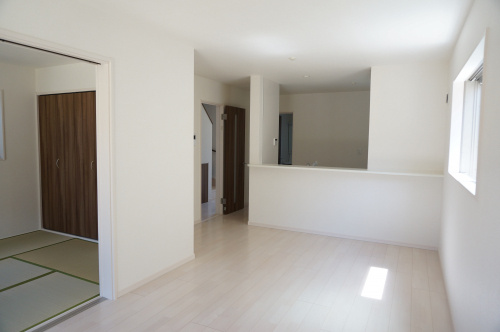 リビングは15帖ですがとなりの洋和室が6帖あります。照明は点けずに撮影しましたが明るいリビングでした。