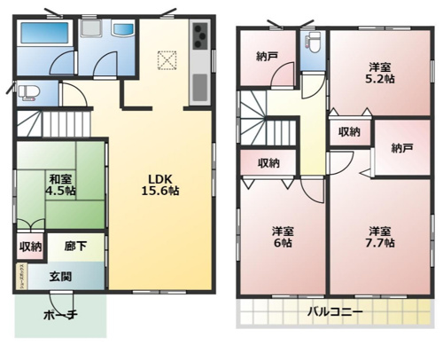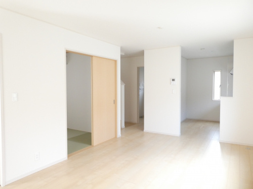 1階LDKは15.6帖で隣の和室は4.5帖となります。リビング内に階段があります。