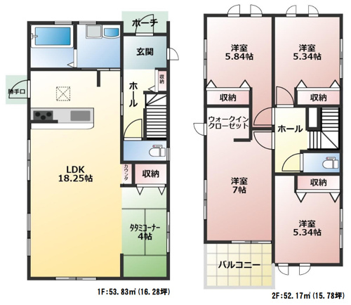 4LDKとウォークインクローゼットの5号棟は1階にLDKとタタミコーナー、2階に洋室4室となります。