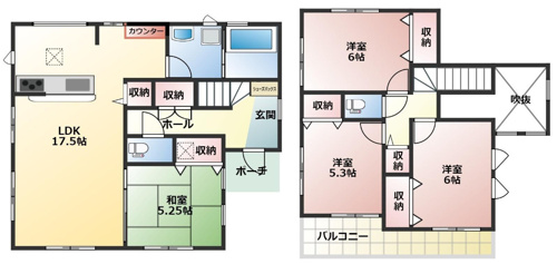 1号棟はキッチンがアイランドキッチンです。玄関入るとシューズインクロークもあります。
