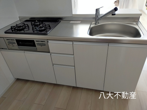 キッチンはシステムキッチンとなっており、コンロは三口、グリル付きです。