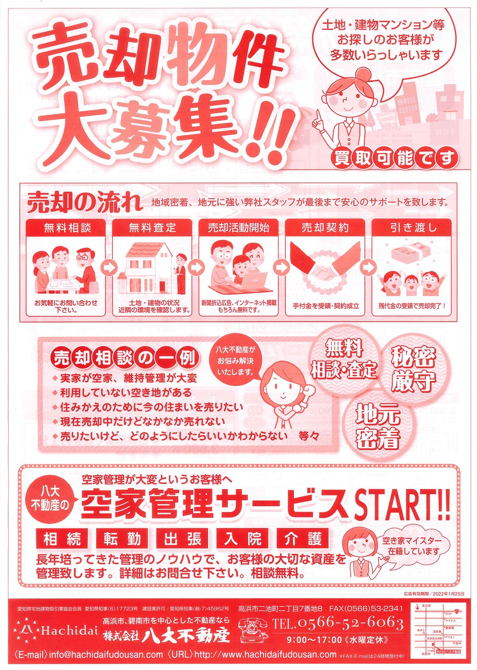八大不動産では、高浜市、碧南市の土地、新築分譲住宅、中古住宅、中古マンション、工場、倉庫、賃貸アパート物件を多数、取り扱っています。