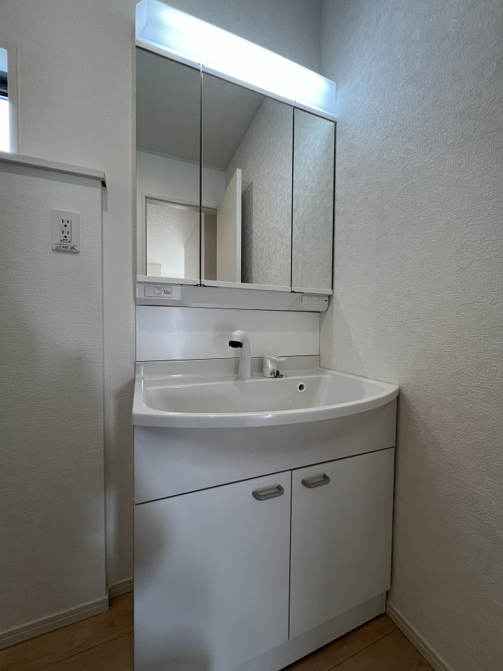 収納やスペースの広い洗髪洗面台は、3面鏡になっており、メイクなどしやすくなっています。